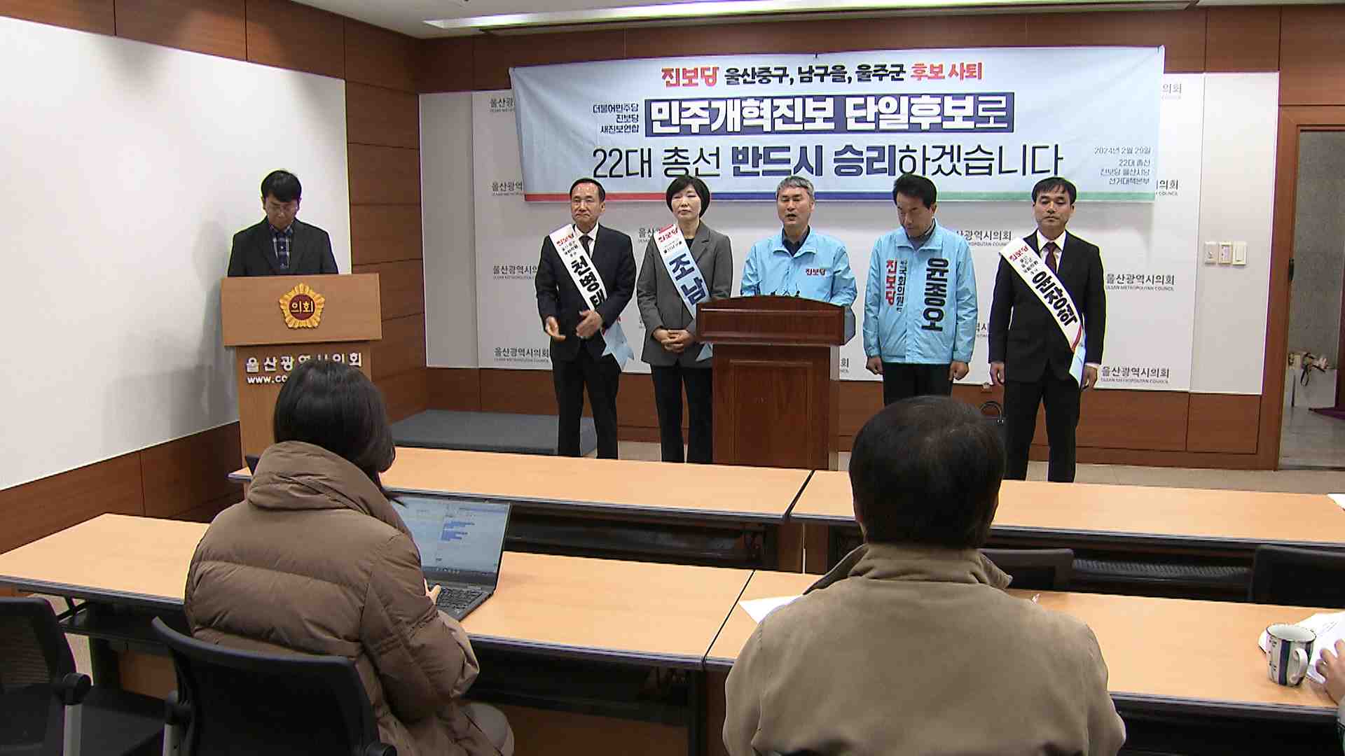 진보당 울산시당은 오늘(2/29) 기자회견을 열고 민주개혁진보연합의 총선 승리를 위해 중구와 남구을, 울주군 지역구 후보들이 동반 사퇴한다고 밝혔습니다.