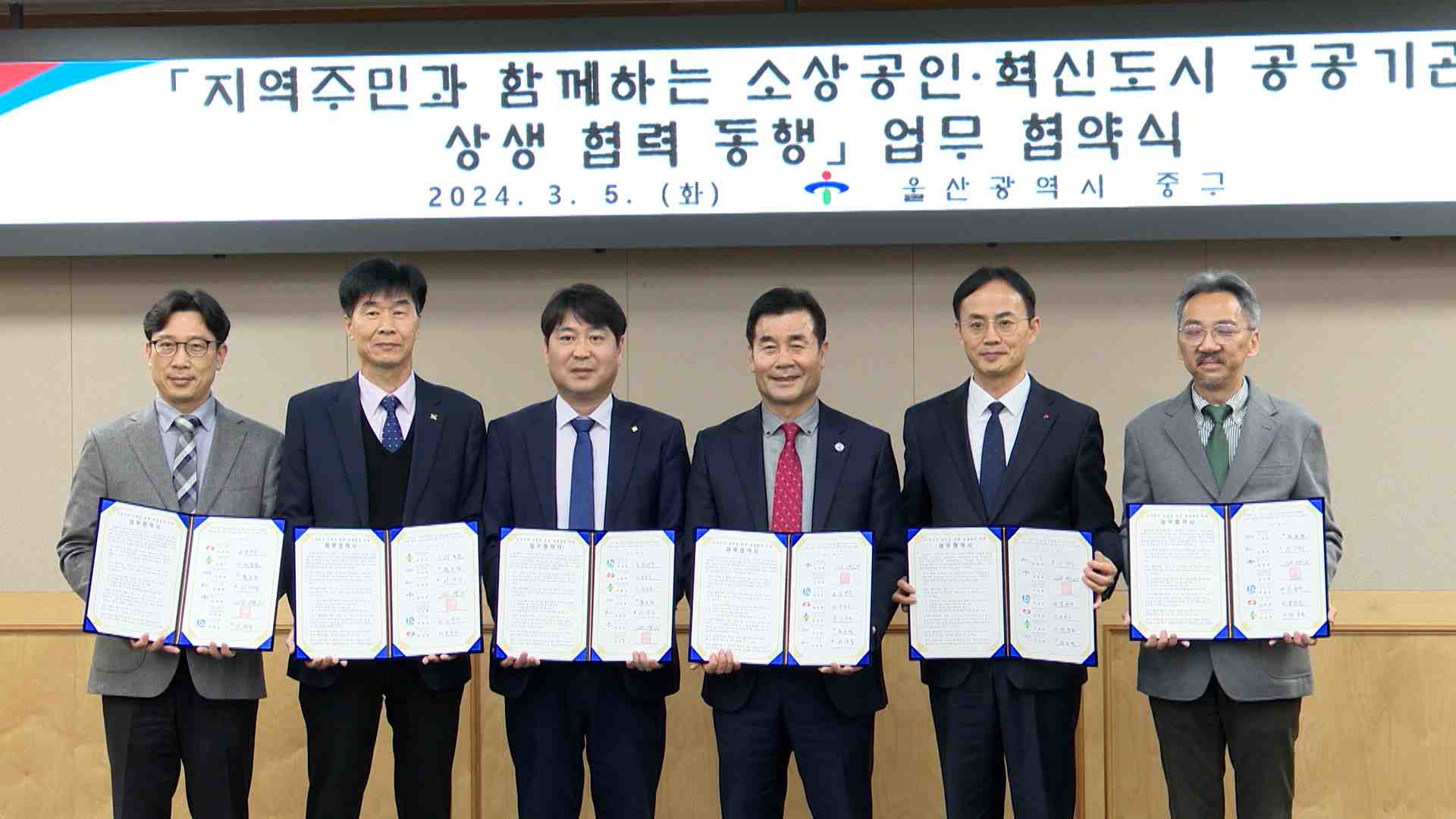 중구와 혁신도시 공공기관 및 단체 6곳 등이 지역 소상공인 지원을 위한 상행 협력 동행 행사 지원을 위한 업무협약을 맺었습니다.