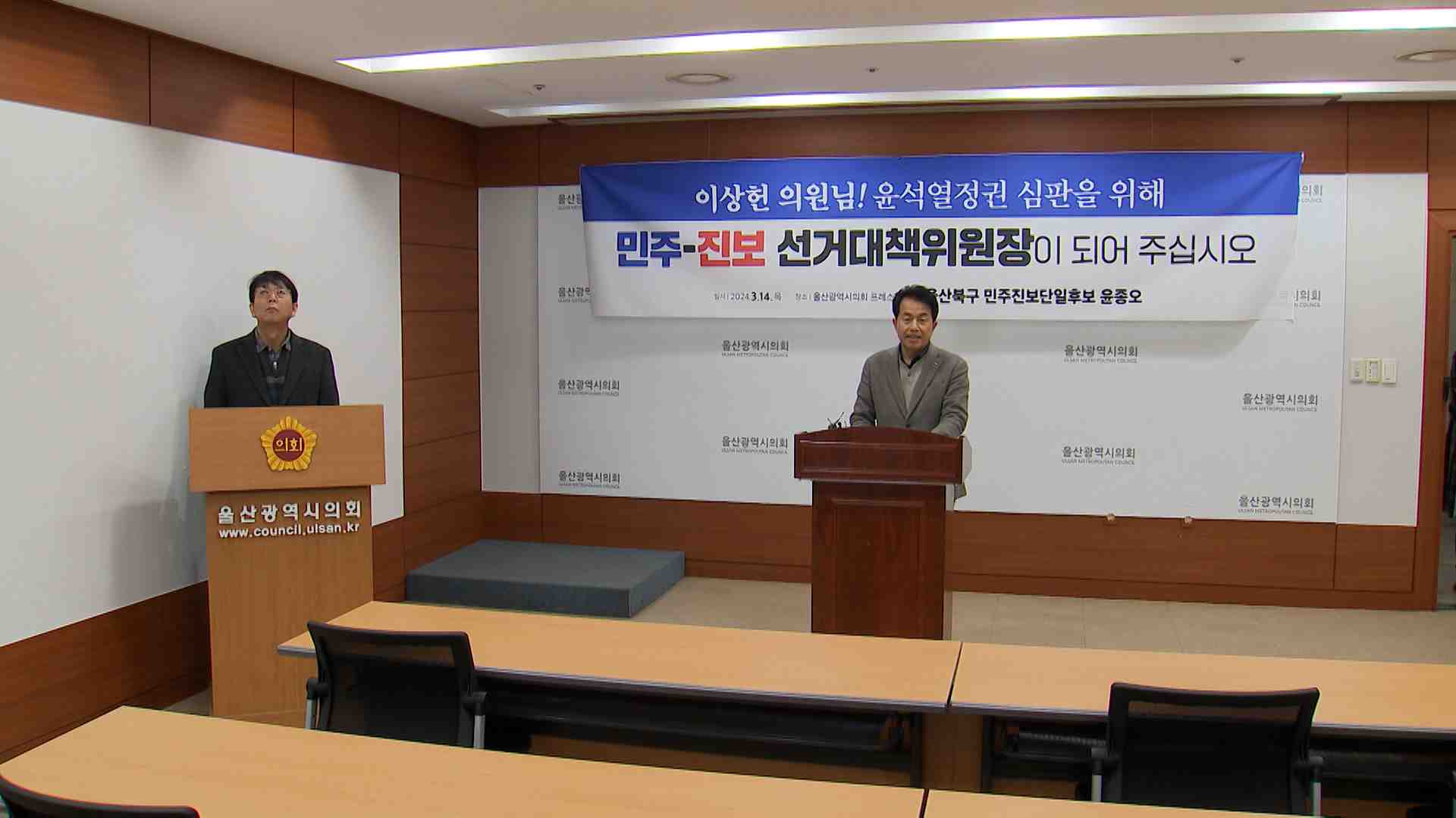 4.10총선 북구 진보당 윤종오 후보는 오늘(3/14) 기자회견을 열고 무소속 이상헌 후보에게 선거대책본부장직을 제안했습니다.