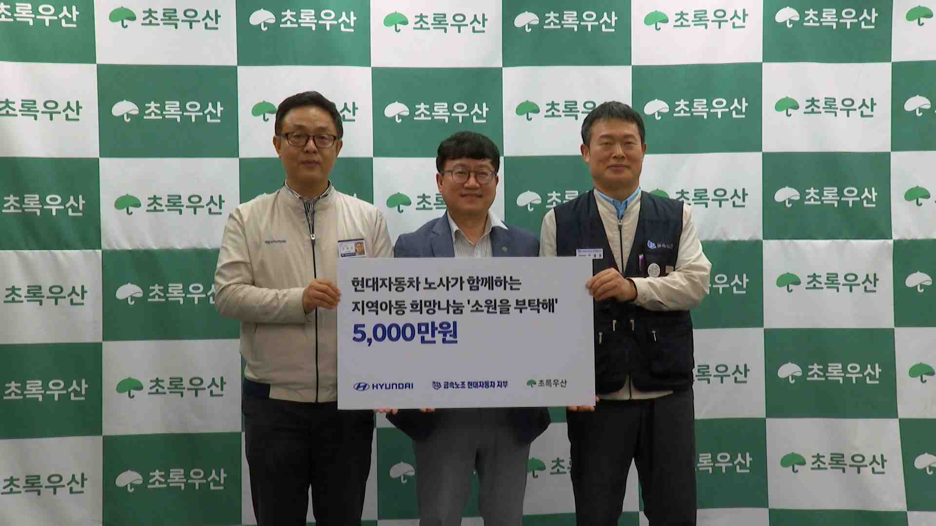현대자동차 노사는 오늘(5/7) 어린이재단 울산지역본부를 방문해 지역아동 희망 나눔 기금 5천만 원을 전달했습니다.