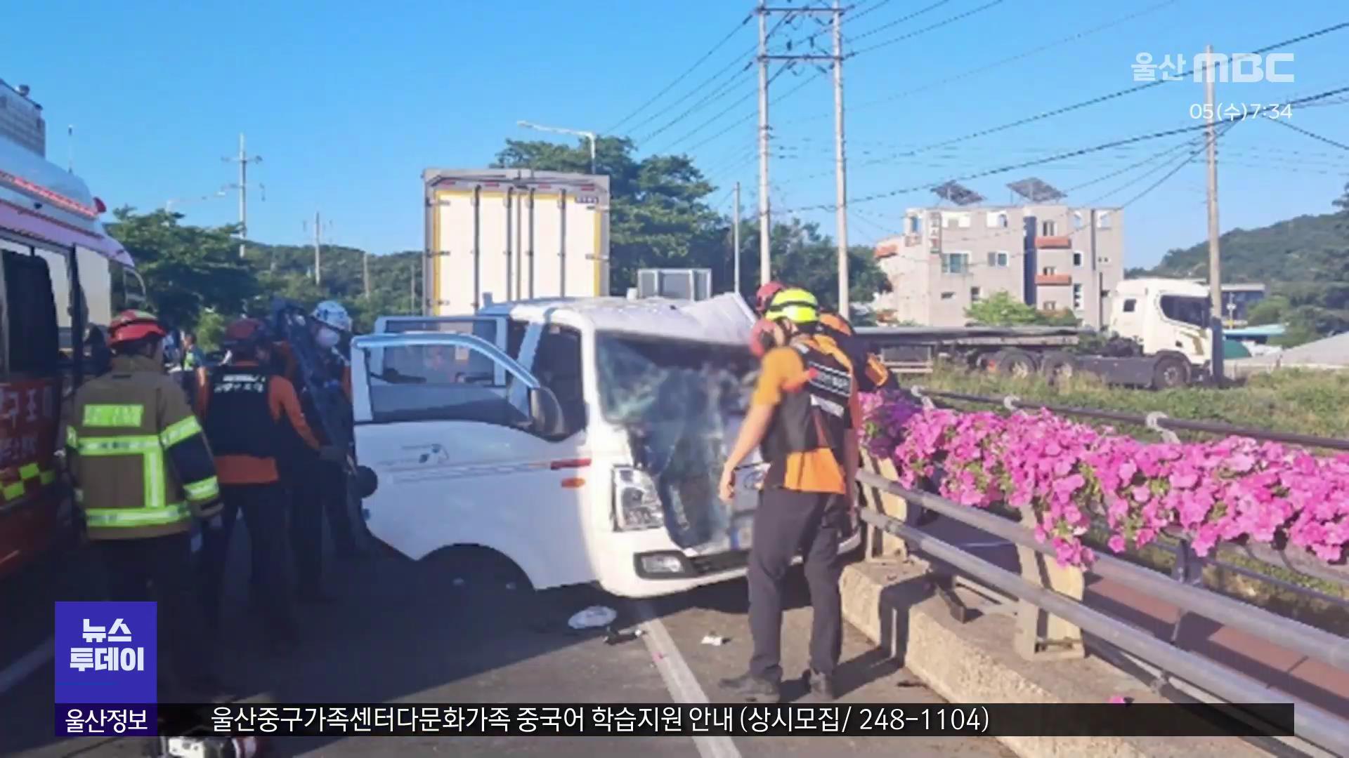 어제(6/5) 저녁 5시 40분쯤 울주군 상북면의 한 교량에서 소형 트럭이 중앙선을 넘어 후진하던 화물차와 부딪치는 사고가 발생했습니다.