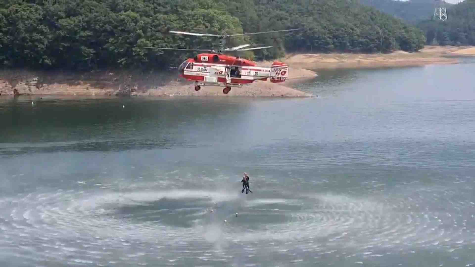 오늘(6/19) 울주군 삼동면 대암댐에서 진행된 훈련은 피서객이 물에 빠진 상황을 가정해 헬기가 현장에 접근한 뒤 소방대원이 곧바로 익수자를 구조하는 방식으로 진행됐습니다.