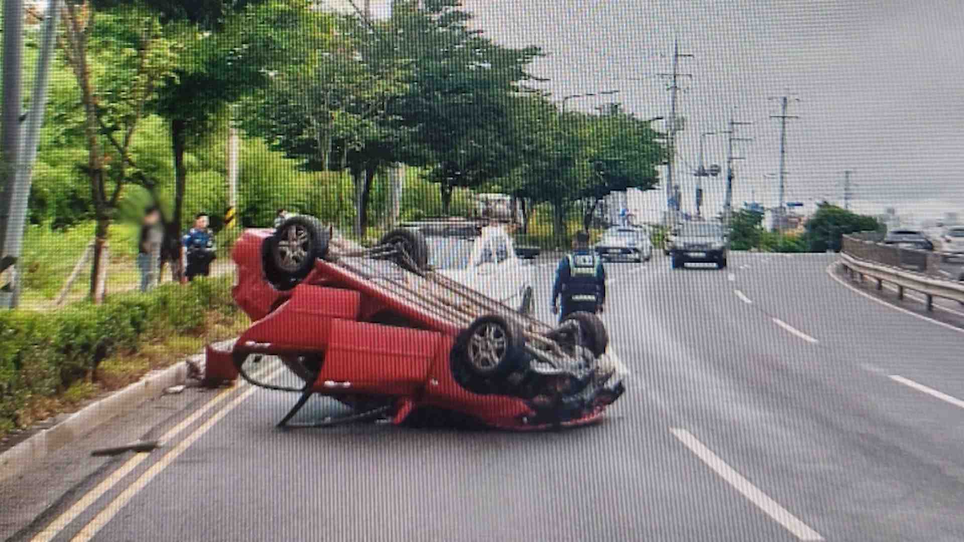 오늘 오후(7/14) 낮 12시 24분쯤 중구 북부순환도로에서 승용차 한 대가 가로수를 들이받고 전복되는 사고가 발생했습니다.