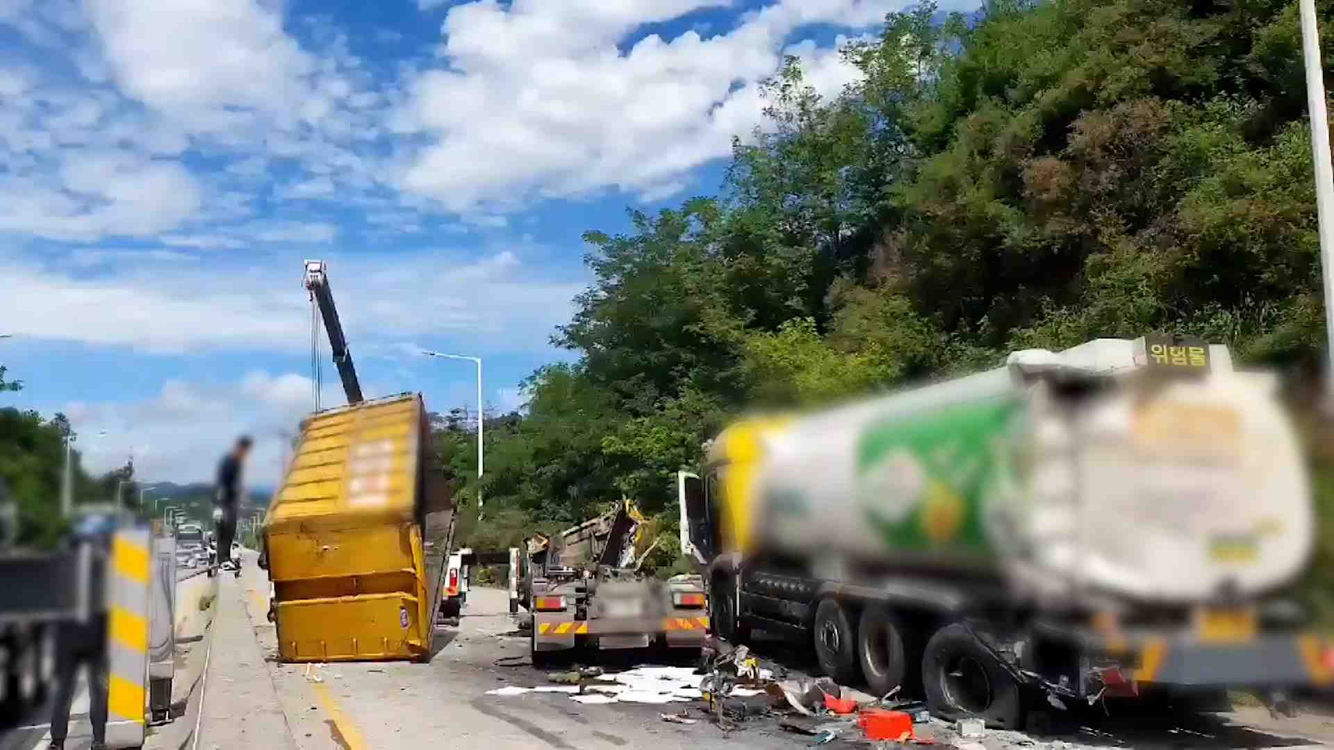 이 사고로 차량 밖에 나와있던 탱크로리 운전자가 중상을 입어 병원으로 옮겨졌습니다.