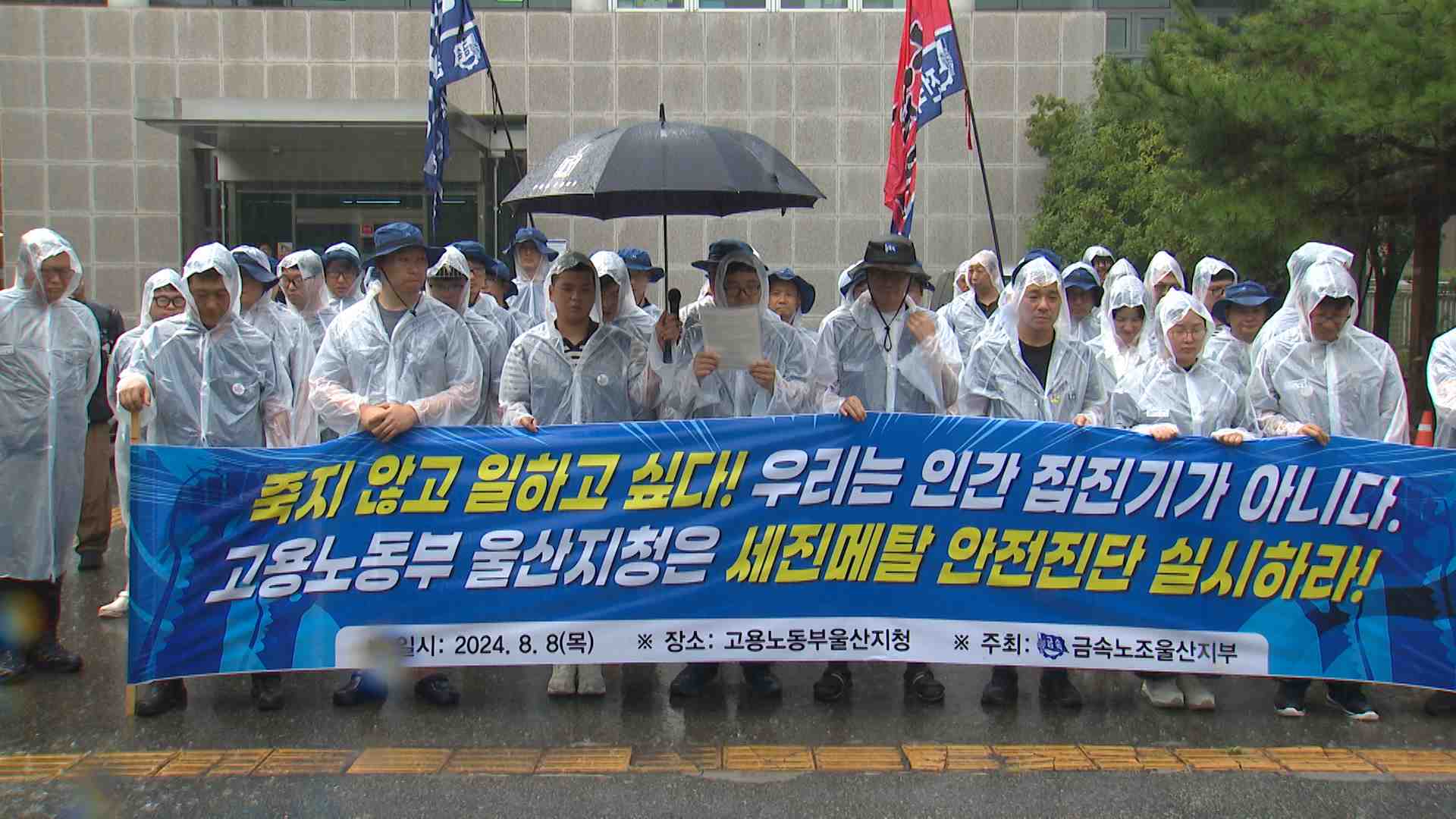 전국금속노조 울산지부는 오늘(8/8) 고용노동부 울산지청 앞에서 기자회견을 갖고 노동부는 세진메탈에 대한 안전진단을 실시하라고 촉구했습니다.