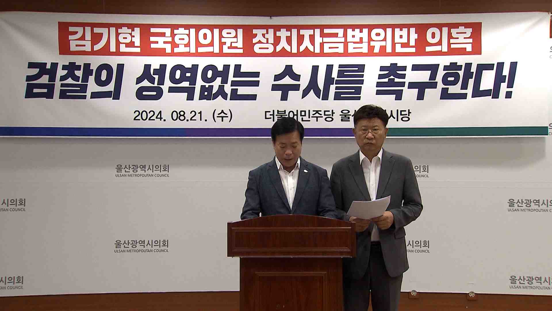 더불어민주당 울산시당은 오늘(8/21) 기자회견을 열고 김기현 의원의 야유회 행사 비용 대납 의혹에 대한 엄정한 수사를 촉구했습니다.