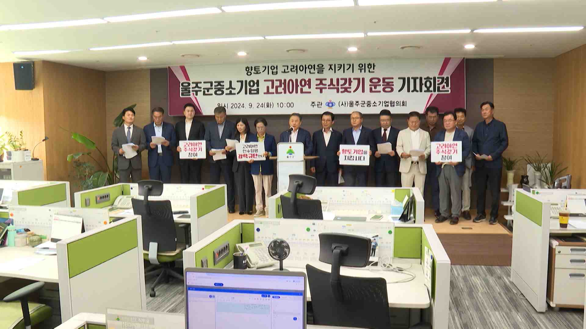 울주군 중소기업협의회는 오늘(9/24) 울주군 프레스센터에서 기자회견을 갖고 향토기업 고려아연을 지키기 위해 주식 갖기 운동에 동참하겠다고 밝혔습니다.