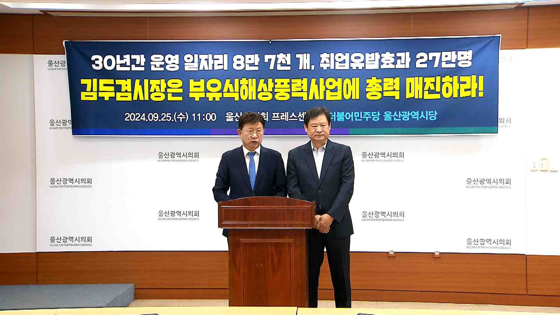 더불어민주당 울산시당은 오늘(9/25) 시의회 프레스센터에서 기자회견을 열고 김두겸 울산시장에게 중단 없는 부유식 해상풍력 사업 추진을 촉구했습니다.