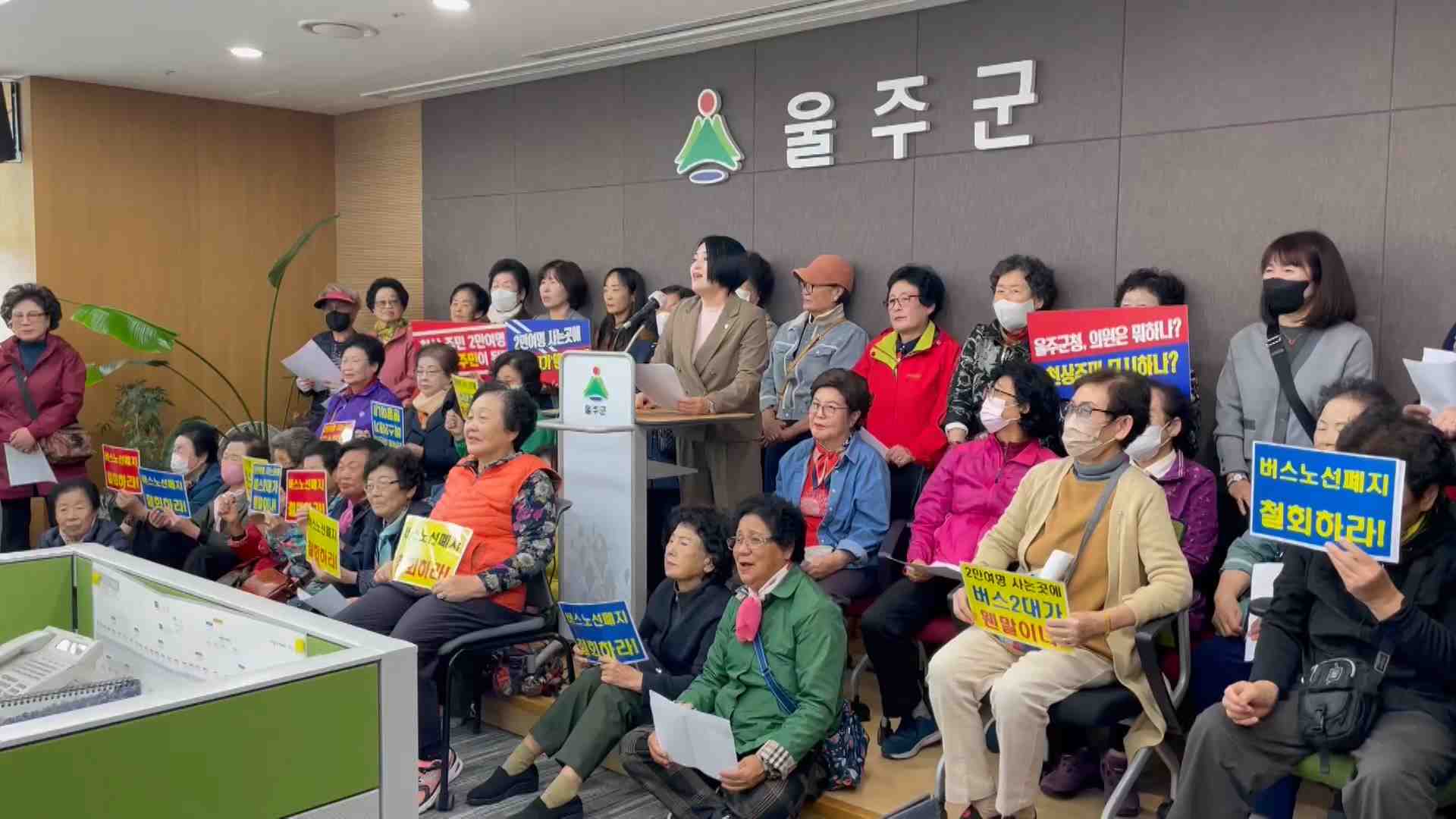 울주군 천상리 주민들이 울주군청에서 기자회견을 열고 123번 버스 노선 폐지 철회를 요구했습니다.