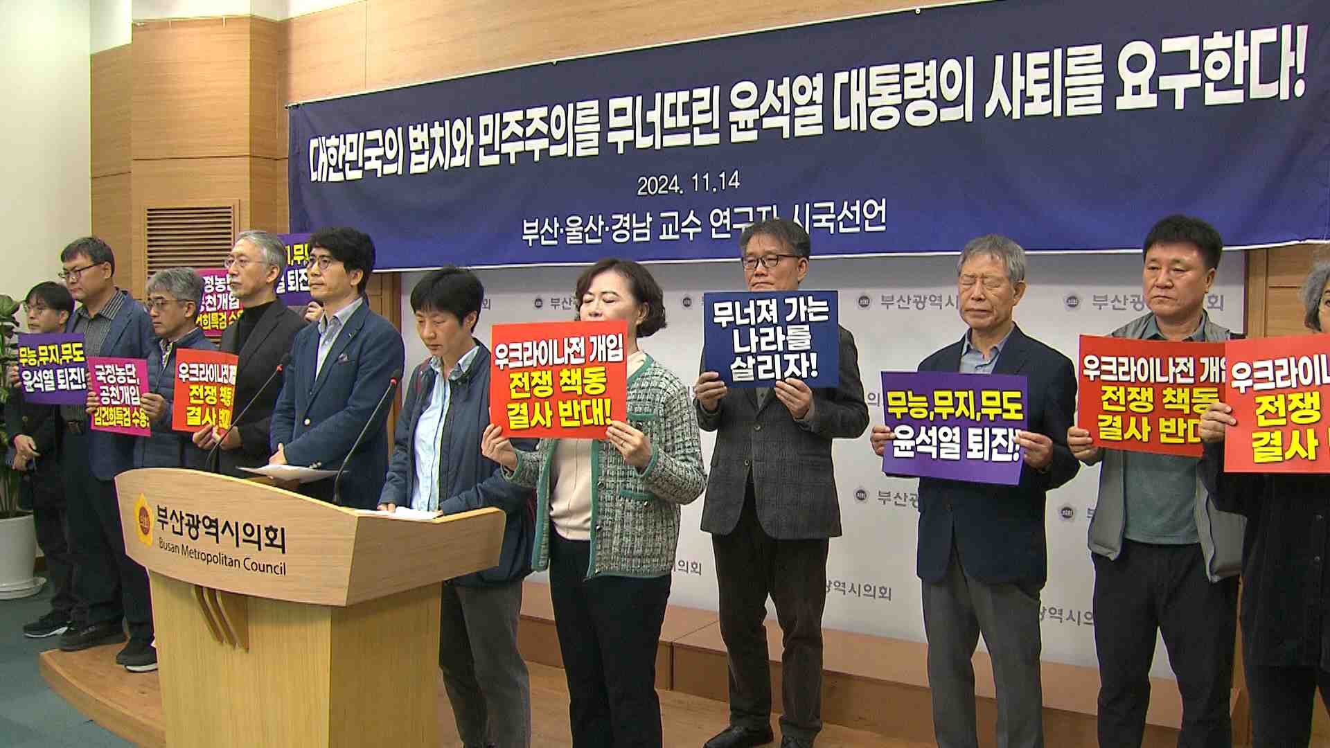 부산과 울산, 경남지역 대학 교수 연구자 연대는 오늘(11/14) 기자회견을 열고 대한민국의 법치와 민주주의를 무너뜨린 대통령의 사퇴를 요구한다고 밝혔습니다.