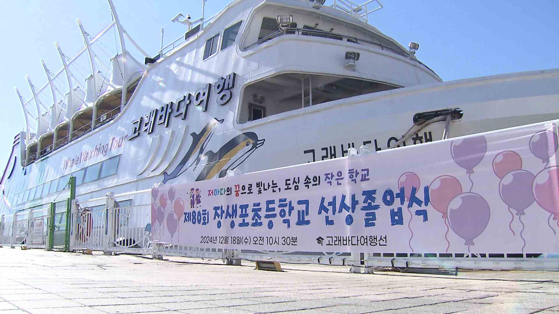 고래문화특구 안에 있는 유일한 학교인 울산 장생포초등학교가 배 위에서 제80회 졸업식을 열었습니다.
