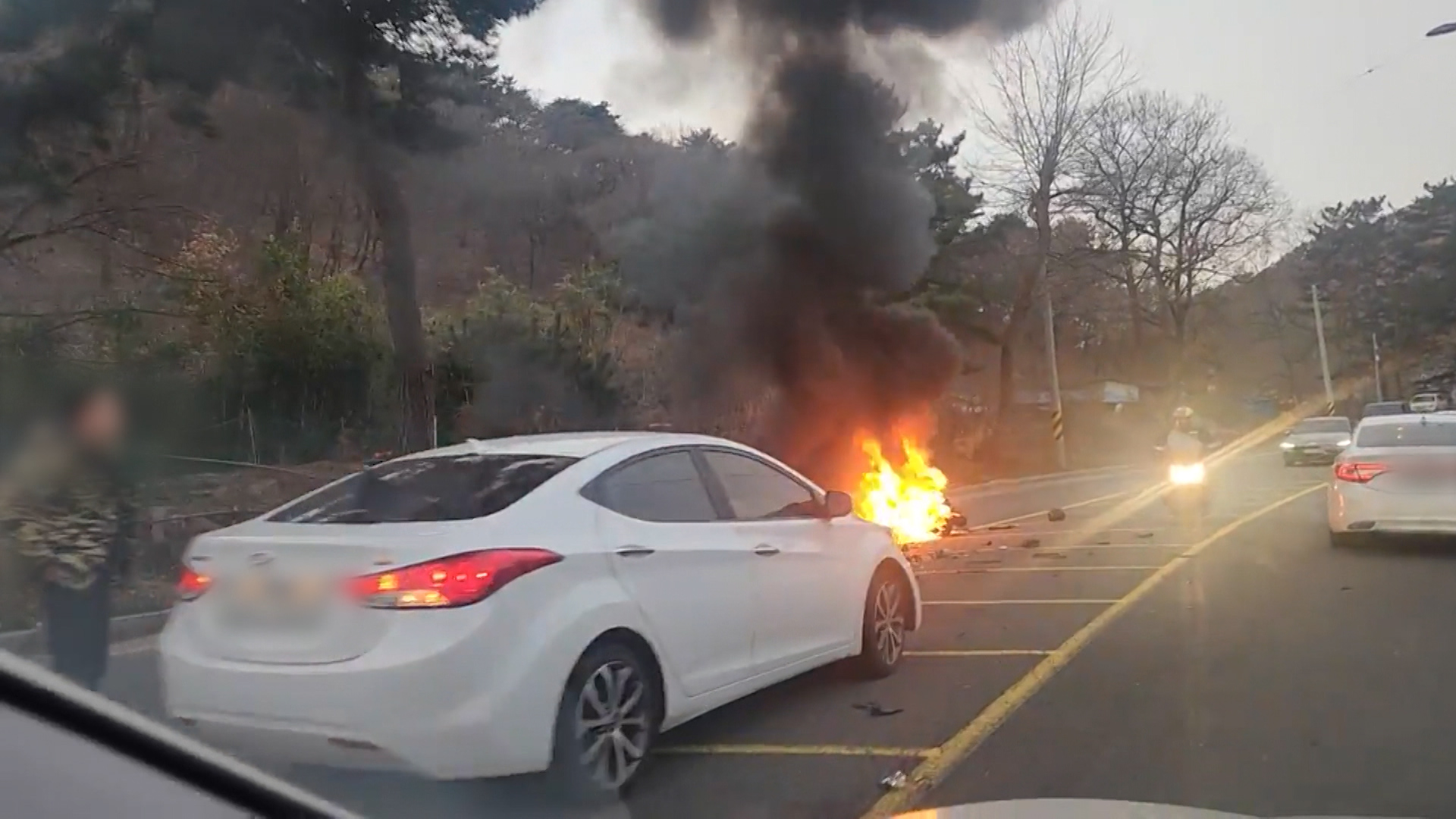 이 사고로 오토바이가 넘어지면서 화재가 발생했고, 운전자 1명이 다쳐 인근 병원으로 옮겨졌습니다.