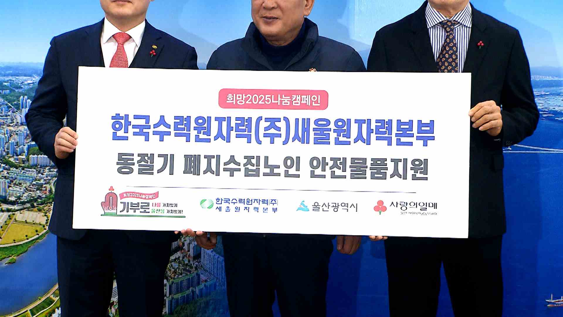 한국수력원자력 새울원자력본부가 오늘(1/17) 울산청을 방문해 폐지수집 노인 방한용품을 전달했습니다.