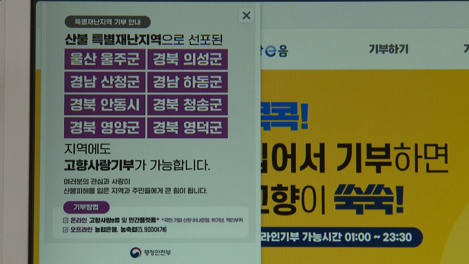 행정안전부의 고향사랑 기부제 현황에 따르면 울주군 산불 피해 복구 긴급 모음에 지금까지 700명 넘게 참여해, 기부금 7천만 원을 넘어섰습니다.