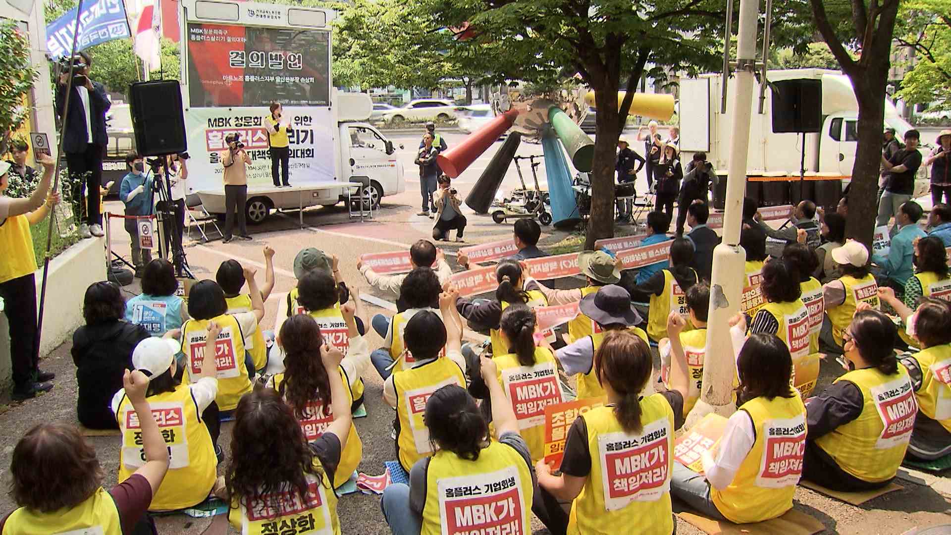 공동대책위는 MBK가 홈플러스를 인수하며 이득만 챙기고 기업 회생을 신청해 홈플러스에서 일하고 있는 10만 여 명의 마트 노동자와 협력업체 직원들이 고통받고 있다고 주장했습니다.