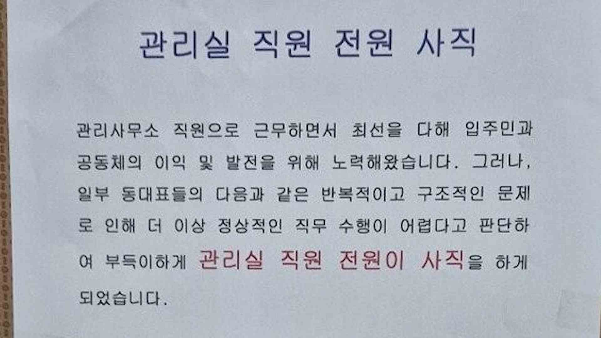 해당 아파트에는 일부 동 대표들의 부당한 책임 전가와 언어폭력, 모욕적 발언 등으로 관리실 직원 전원이 사직한다는 내용이 게시됐습니다.
