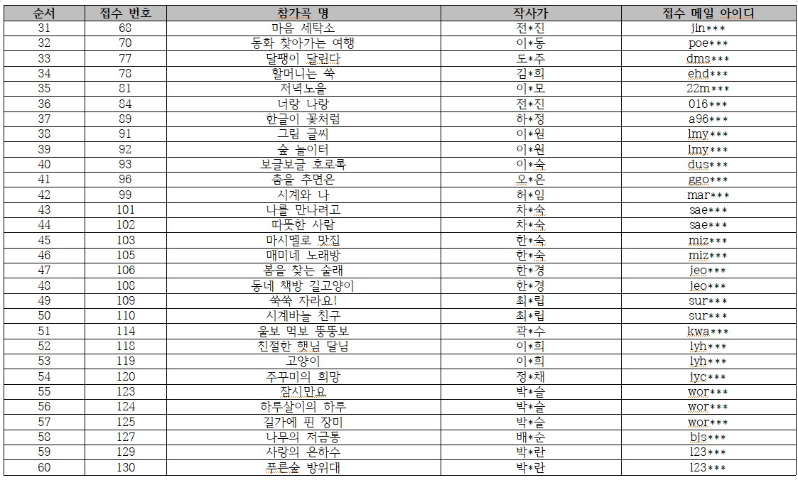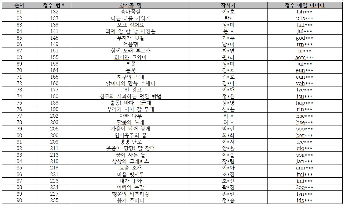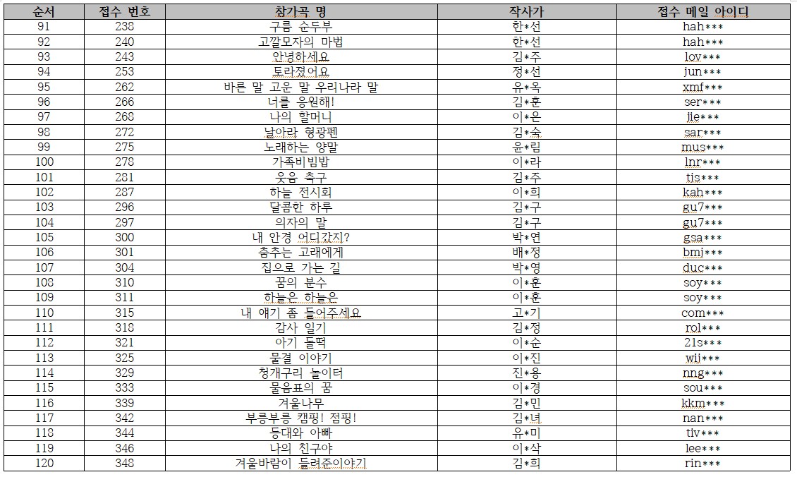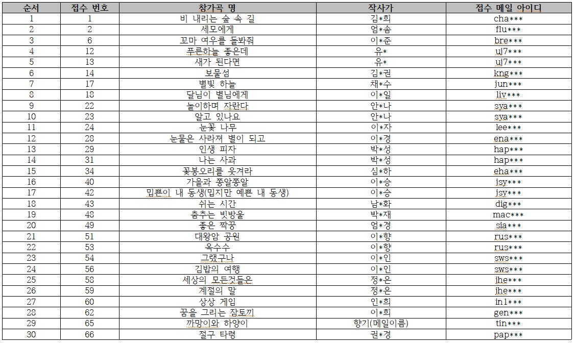 ▲ 첨부된 선정명단과 노랫말 파일을 참고하시어 4월 13일(일) 24:00까지 완성곡을 아래와 같이 보내주시기 바랍니다.