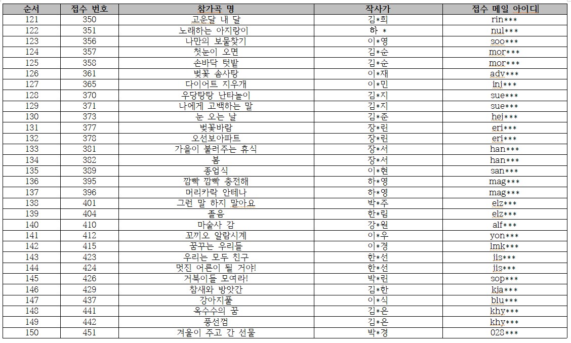 - 첨부파일 glhVt1aXKvO-(홈페이지 게시용)2025 서덕출 창작동요제_노랫말.hwp (152.50 KB) 다운로드