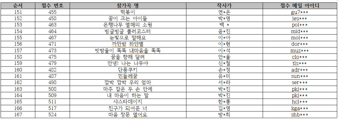 20주년을 맞이하여 처음으로 시행한 노랫말 사전 응모에 총 526편이 접수되었으며 최종 167편을 선정하였습니다.
