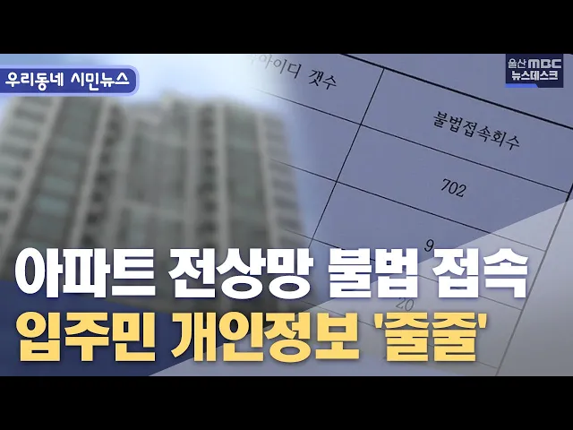 [앵커] 울산MBC와 울산시청자미디어센터가 함께 만드는 우리 동네 시민뉴스입니다. 울산지역 아파트 전산망에 외부 업체가 불법으로 들어와서 입주민들의 개인정보를 보고 있습니다. 그런데 대처는 허술한 것으로 드러나 주의가 요구되고 있습니다. 김인택 시민기자 입니다. [리포트] 울산 남구의 한 대단지 아파트 입니다....