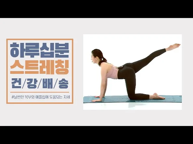 여러분의 일상에 건강을 배송해드립니다. 오늘 [하루십분 스트레칭]에서는 날씬한 복부와 애플힙에 도움이 되는 '캣 스트레칭 킥'에 대해 알아보겠습니다. 캣 스트레칭 킥 1.네발기기 자세에서 허리를 최대한 둥글게 말고 왼쪽 무릎을 접어 가슴 앞으로 가져옵니다.캣 스트레칭 킥 2.시선은 무릎을 바라보고 다리를 뻗을 때...