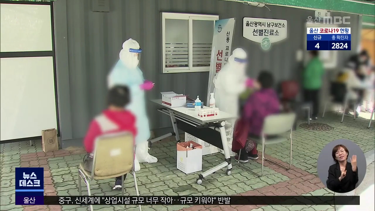 오늘(6/29) 울산에서는 코로나19 신규확진자 4명이 추가로 발생했습니다. 남구에 사는 신규 확진자는 서울 확진자와 다른 한명은 밀양 확진자와 접촉해 감염된 것으로 파악됐습니다. 나머지 2명에 대해서는 감염 경로를 조사하고 있습니다. 이로써 지역 누적 확진자는 2천824명으로 늘었습니다. //