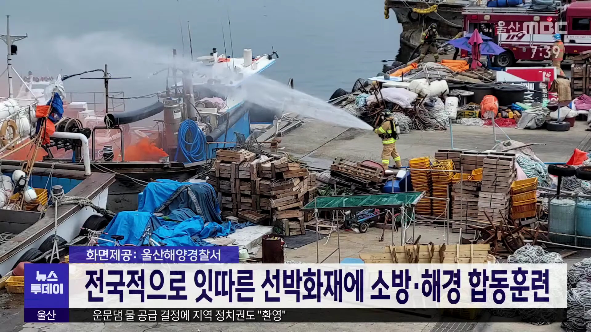 북부소방서와 울산해경, 한국해양구조협회 등이 오늘(6/24) 북구 정자항에서 선박 화재 진화 훈련을 진행했습니다. 이들은 최근 제주도와 충북 태안 등에서 잇따라 선박 화재가 발생하자 특수화재 대응 역량 강화를 위해 합동 훈련을 계획했다고 밝혔습니다. 훈련은 방파제에 정박 중이던 어선에서 화재가 난 상황을 가정해...