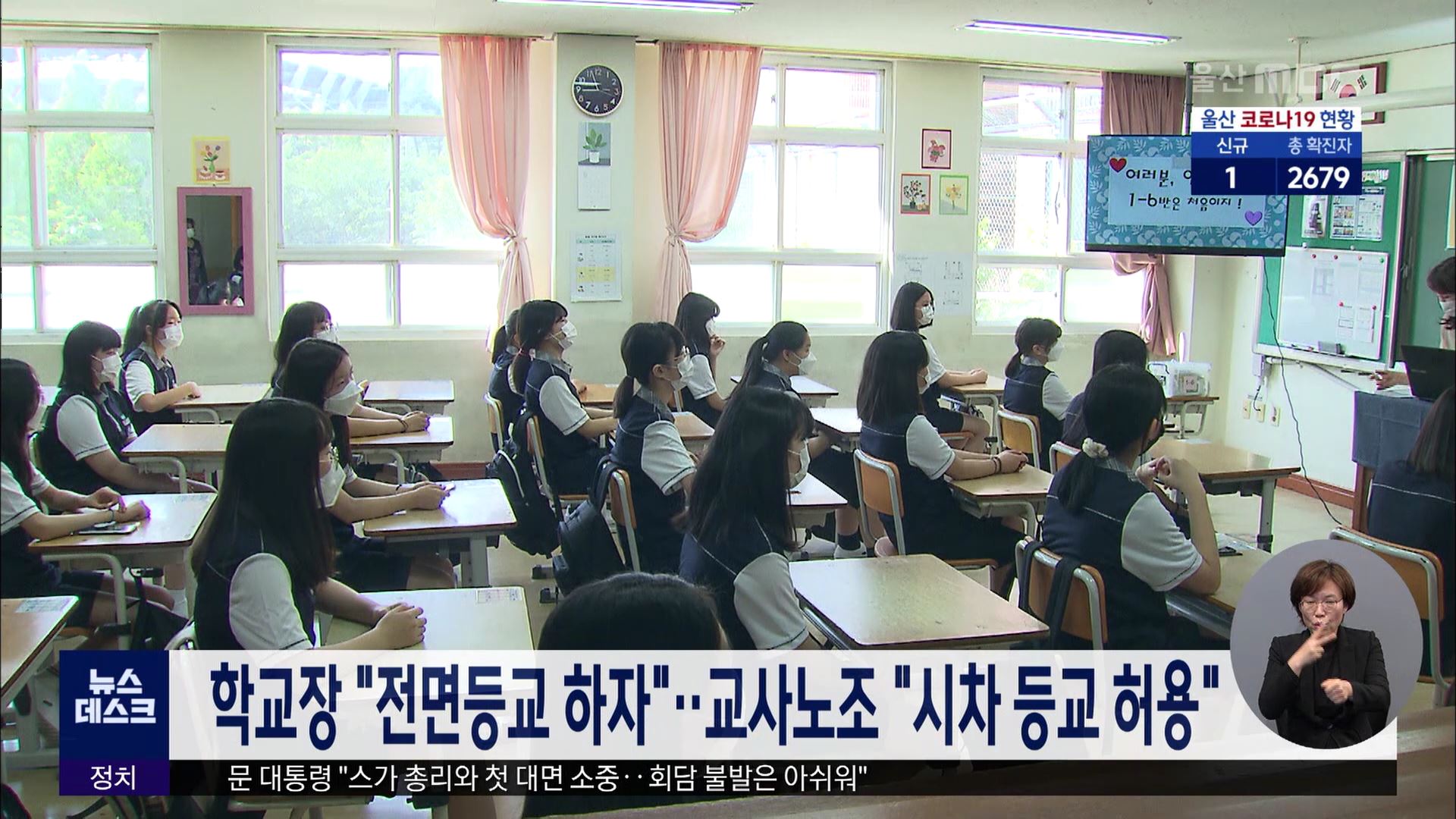 울산교육청이 전면 등교를 검토하자 학교장들은 이에 공감했고 교사 노조는 시차 등교 등을 허용하자고 제안했습니다. 오늘(6/14) 초중고등학교 학교장들은 학력 격차와 학부모의 돌봄 피로 등을 이유로 전면 등교가 필요성을, 울산교사노동조합은 학교 자율로 10분 단축 수업이나 오전, 오후반 등 시차 등교 허용을 제안했...
