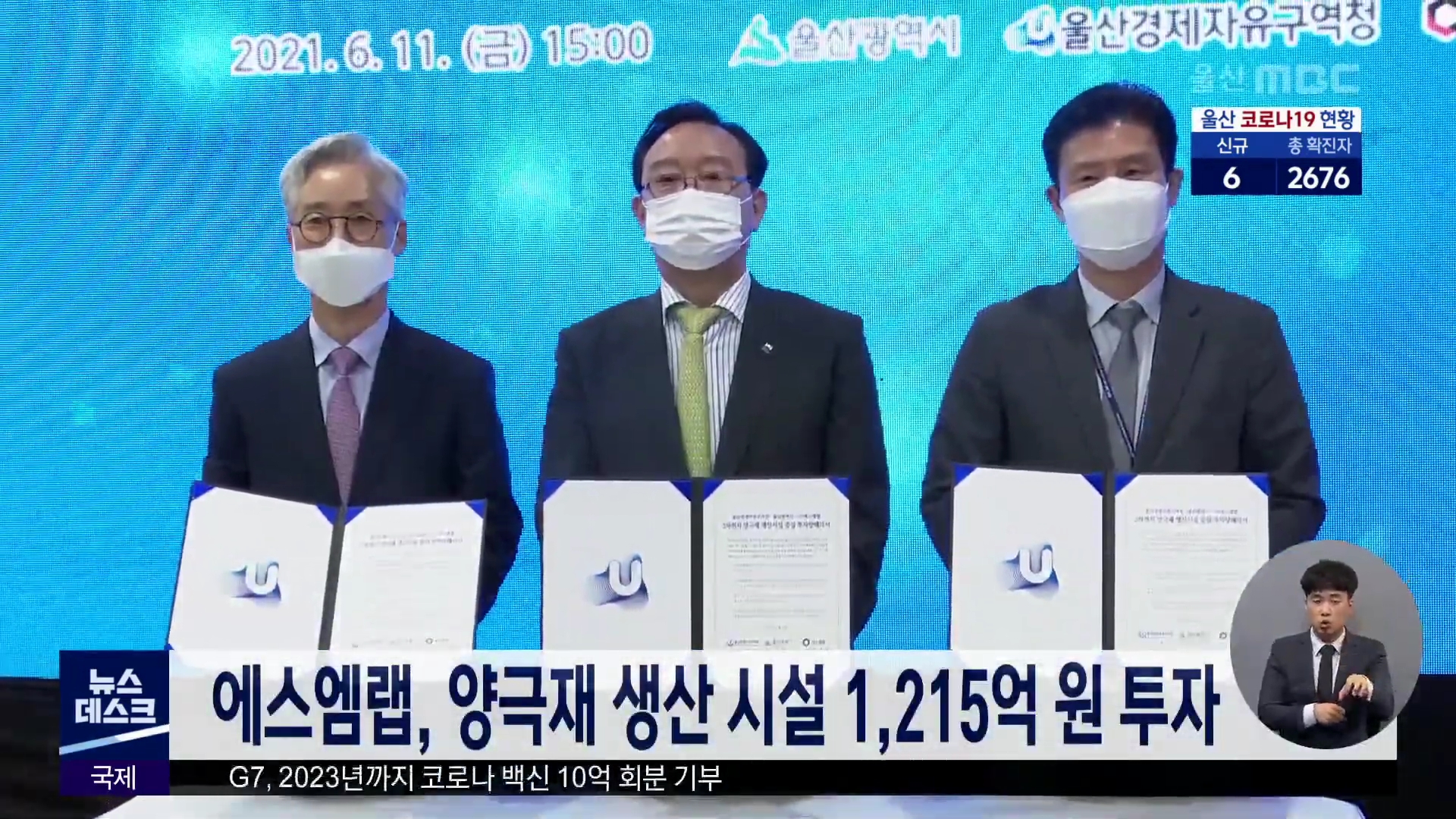 울산시와 울산경제자유구역청, 에스엠랩은 오늘(6/11) 2차전지 양극재 생산 시설 증설을 위한 투자양해각서를 체결했습니다. 울주군 삼남읍에 위치한 에스엠랩은 리튬 2차전지의 주요 소재인 양극재를 제조하는 기업입니다. 이 회사는 이번에 1천215억 원을 투자해 제3공장을 증설할 계획입니다. //