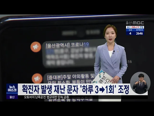 울산시는 코로나 확진자 발생 현황을 알리는 긴급 재난 문자 발송 횟수를 하루 3회에서 1회로 조정합니다.울산시는 어제(6/7)부터 사회적 거리 두기가 2단계에서 1.5단계로 완화됨에 따라 재난 문자 발송 횟수를 줄인다고 설명했습니다.하지만 울산시는 집단감염 발생이나 확진자 방문 장소 검사 등 긴급히 알려야될 내용이...