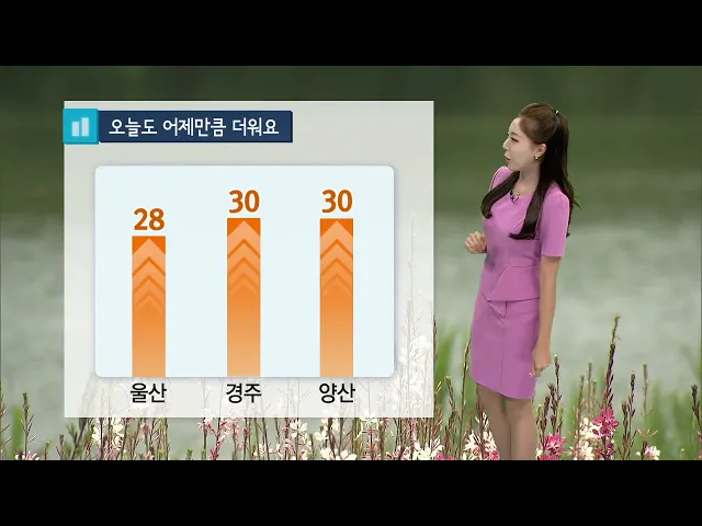 [오늘도 더워요.. 미세먼지 농도 '나쁨']1) 오늘도 어제만큼 덥겠습니다. 화요일인 오늘 하늘은 맑은 가운데 낮 동안에는 대부분 지역에서 기온이 쑥쑥 올라 덥겠는데요. 울산의 낮 최고기온은 28도, 경주와 양산의 낮 최고기온은 30도로 예상돼 평년기온보다도 1~5도가량 더 높겠습니다. 옷차림은 가볍게 해주시면 되겠습...