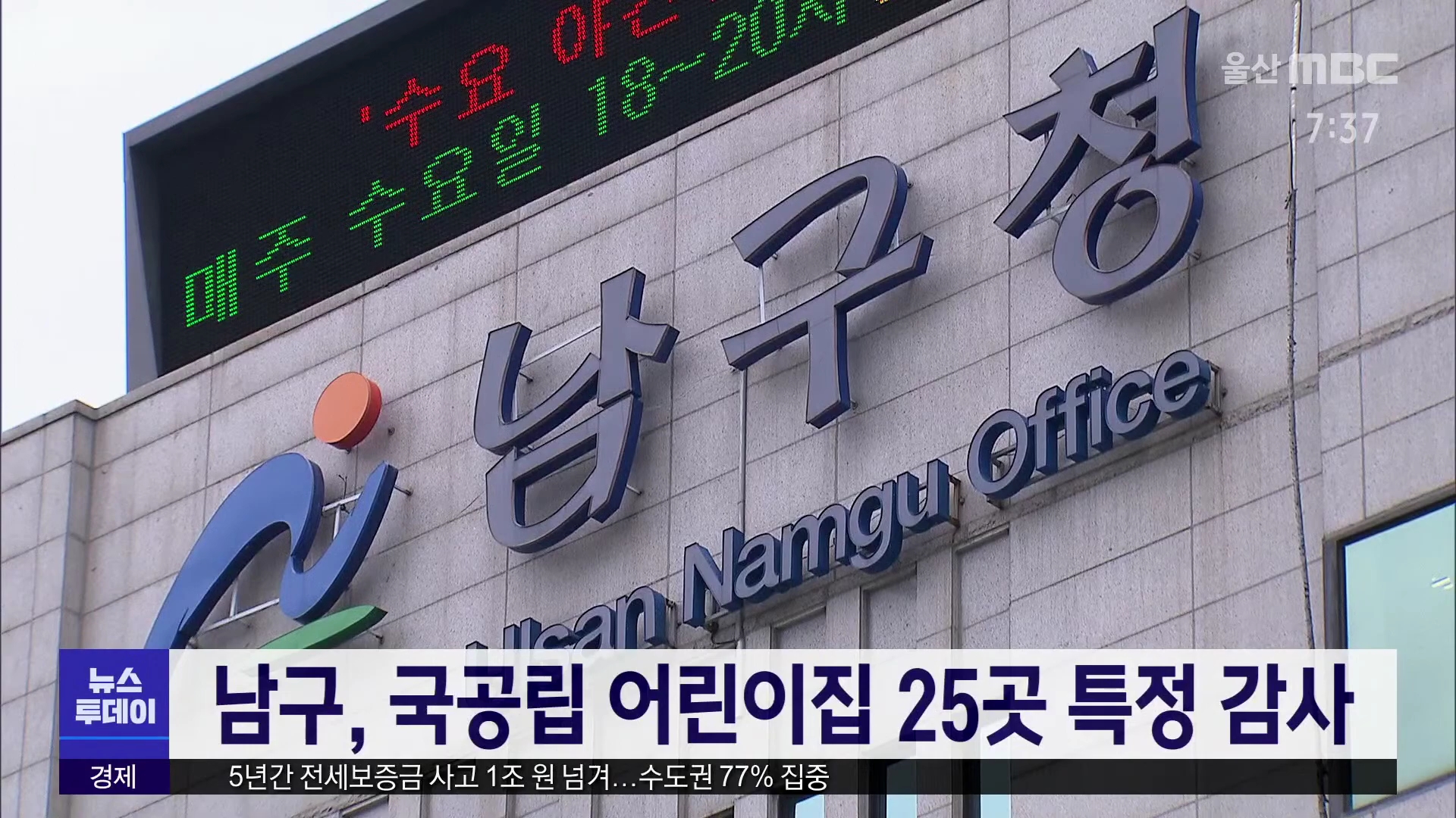 최근 남구의 한 어린이집 보육교사들이 40여명의 원생에게 수백건에 이르는 학대를 가한 정황이 드러나면서 남구청이 오는 14일부터 25일까지 국공립 어린이집 25곳을 대상으로 특정 감사에 들어갑니다. 아동학대 예방에 중점을 둔 이번 감사는 CCTV 현황과 보육교사 근무 여건 등 어린이집 운영 전반을 들여다 볼 예정입니...