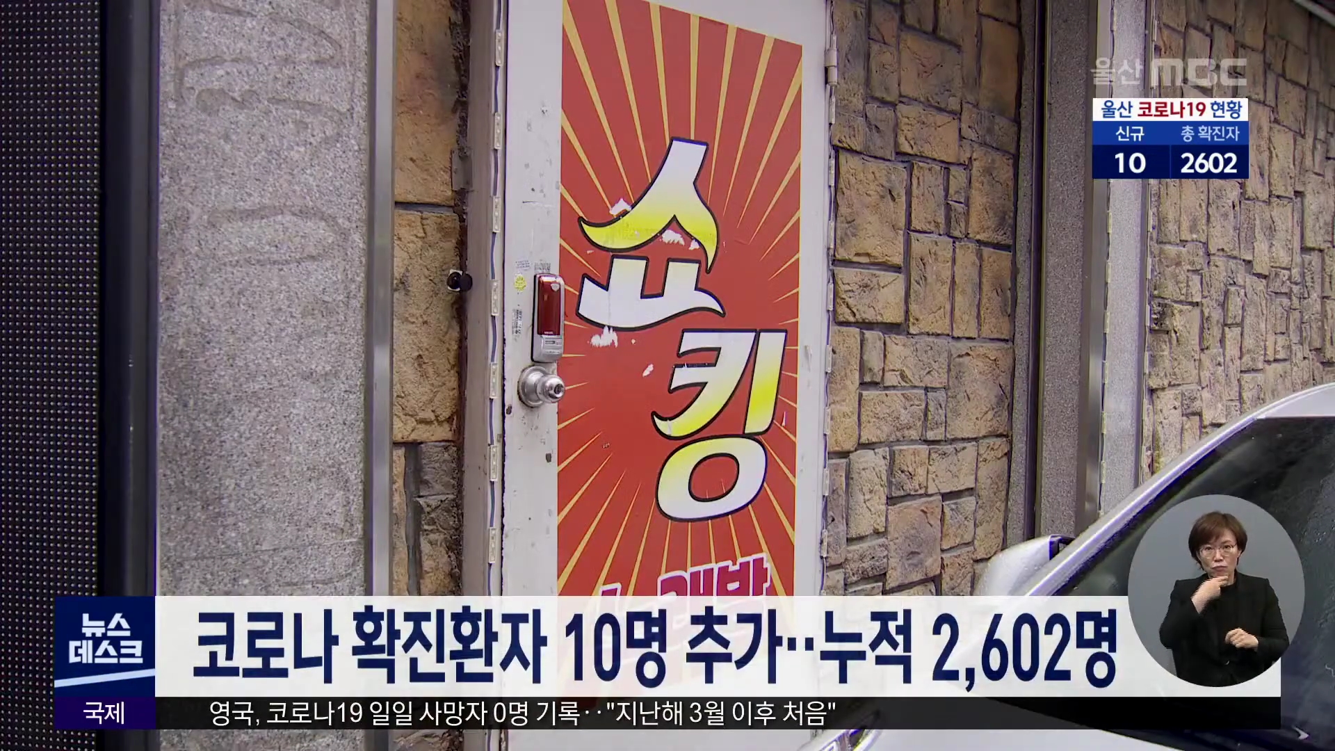 오늘(6/2) 울산에서는 코로나19 확진환자 10명이 추가됐습니다. 이중 1명은 쇼킹 유흥주점 관련 집단 감염 사례이며, 나머지 9명은 기존 확진자와 접촉해 감염된 것으로 나타났습니다. 이로써 지역 누적 확진환자는 2천602명으로 늘었습니다. //