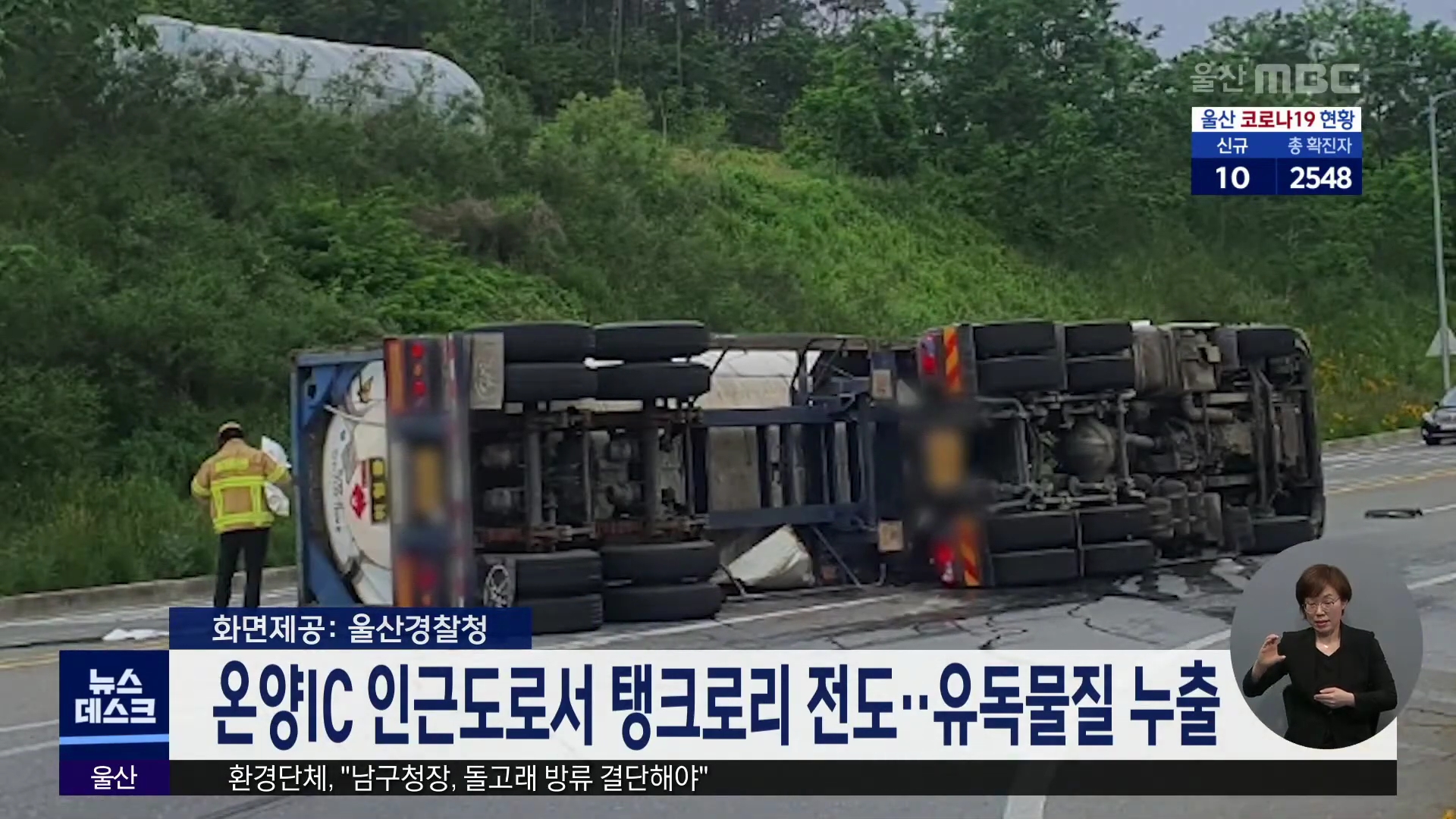 오늘(5/26) 오전 6시 13분쯤 울주군 온양읍 부산~울산고속도로 온양IC 진입도로 인근에서 유독물질을 실은 20톤급 탱크로리 차량이 넘어지는 사고가 발생했습니다. 이 사고로 운전자 50대 A 씨가 부상을 입었고 호흡 곤란 등을 유발하는 유해화학물질인 에틸리덴 노보르닌 일부가 유출됐습니다. 경찰과 소방당국은 유출량은...