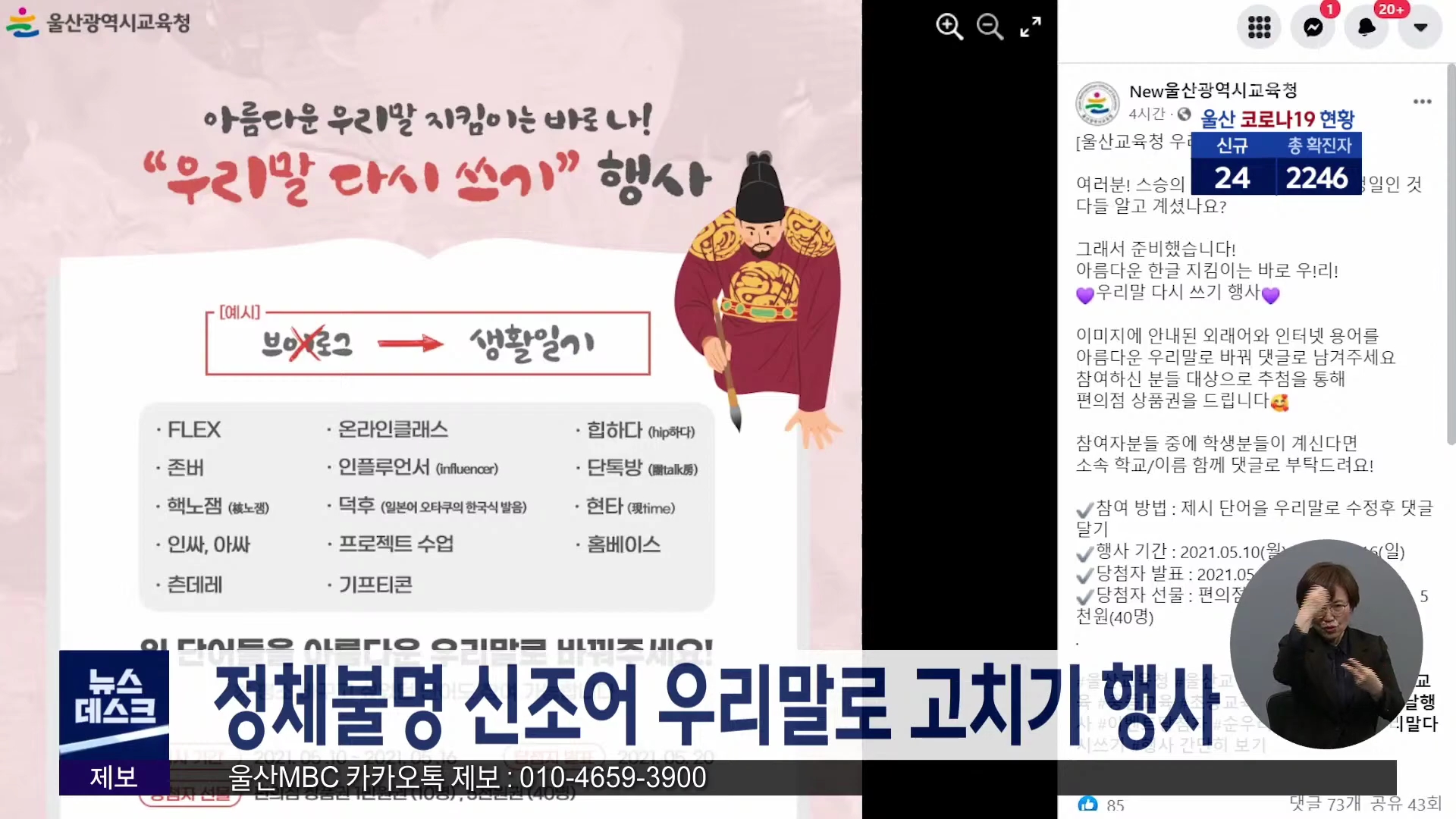 울산교육청이 정체불명의 신조어를 우리말로 바꾸어 다시 써보는 행사를 엽니다. 우리말 다시쓰기 행사는 중고등학생이 일상생활에서 무분별하게 사용되는 외국어와 비속어, 지나친 축약어를 우리말로 어떻게 바꿀지를 제안하는 행사입니다. 참여기간은 오늘(5/10)부터 오는 16일까지이며 울산교육청 페이스북에 접속하여 ...