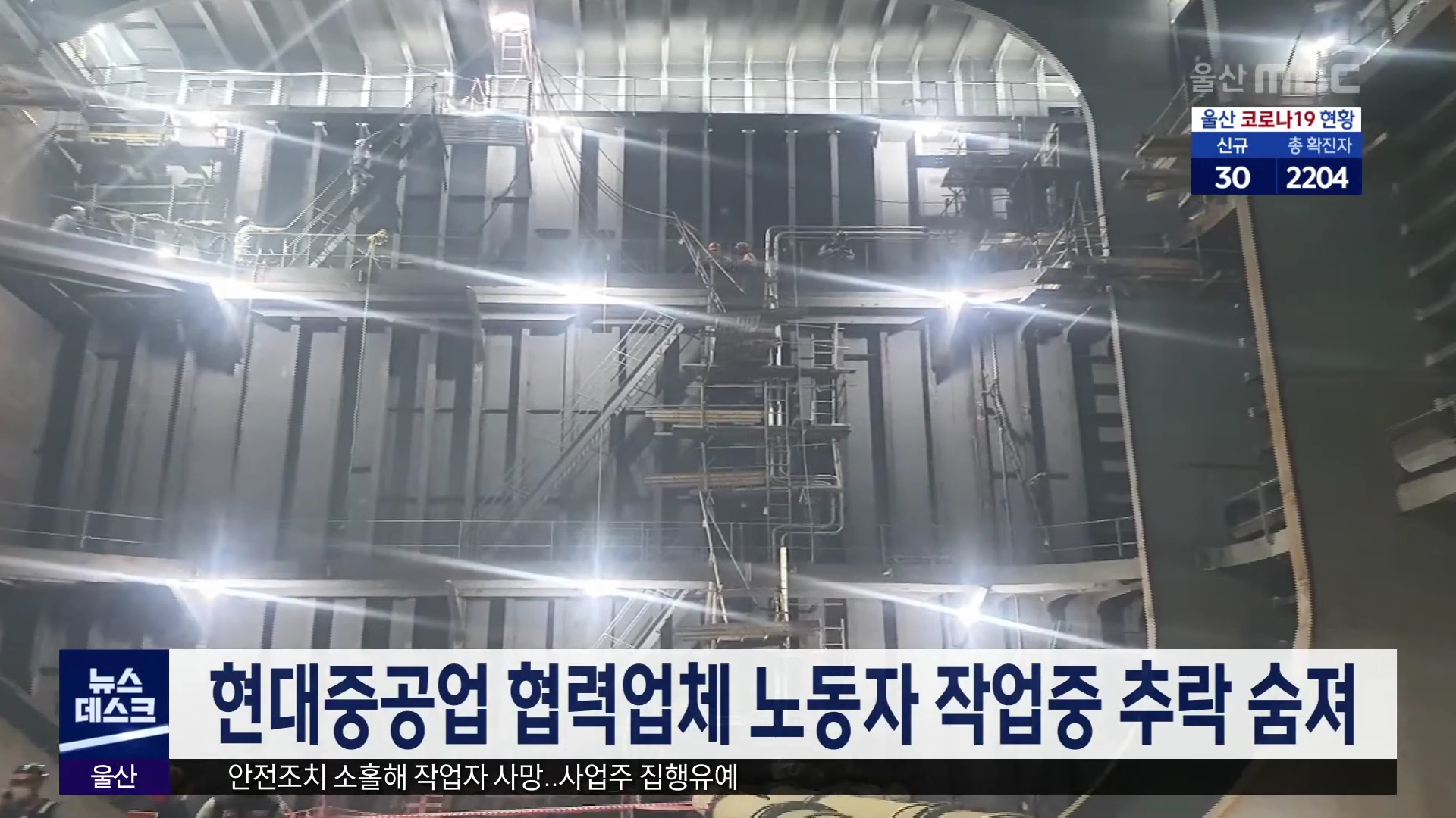 오늘(5/8) 오전 8시 55분쯤 현대중공업 울산조선소에서 협력업체 노동자 40살 A씨가 추락해 병원으로 이송됐지만 숨졌습니다. 용접 보조공인 A씨는 건조 중이던 선박의 11m 높이 탱크에서 작업을 하다 떨어진 것으로 추정됩니다. 경찰과 노동부는 작업 중단 명령을 내리고 정확한 사고 원인을 조사 중입니다. --- 앞서 어제...
