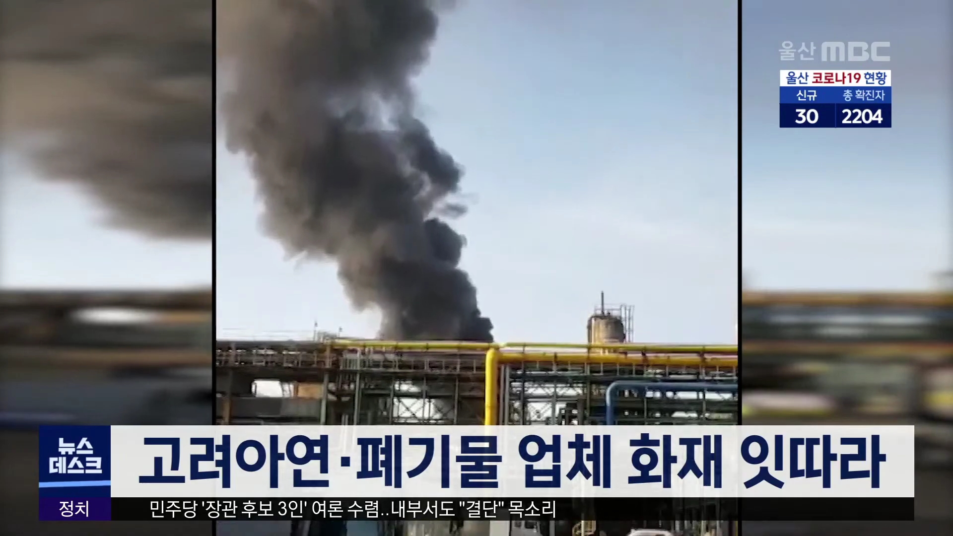 오늘(5/8) 오전 7시 10분쯤 울주군 온산읍 고려아연 공장에서 불이 나 굴뚝 구조물 일부를 태워 소방서 추산 770만 원의 재산 피해를 내고 40분 만에 꺼졌습니다. 소방당국은 검은 연기와 함께 불길이 치솟았다는 작업자 진술을 토대로 정확한 발화 지점과 원인을 조사하고 있습니다. 또 오전 11시쯤에는 울주군 온양읍의 ...