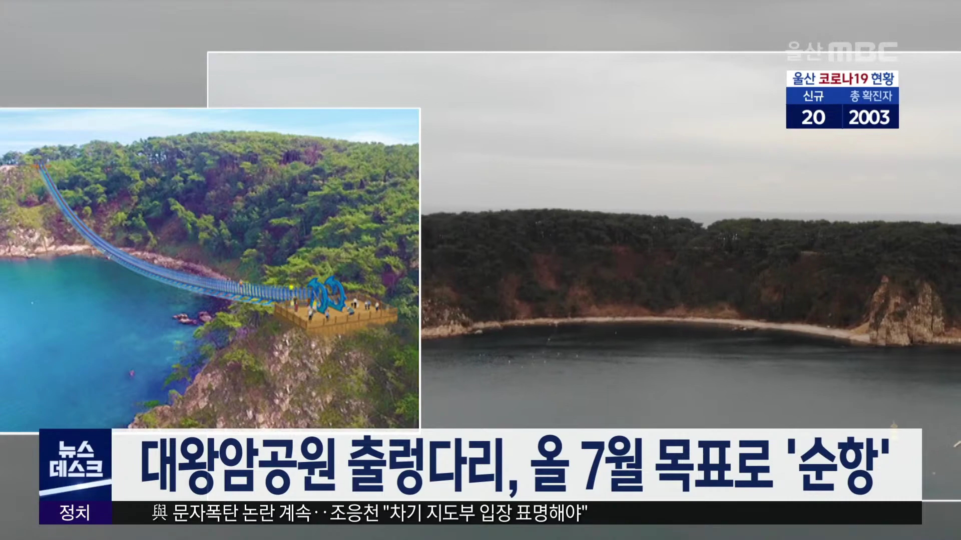 해양관광 사업을 위해 동구가 추진 중인 대왕암공원 출렁다리가 오는 7월 마무리를 목표로 조성중입니다. 지난해 8월 착공한 대왕암 출렁다리는 길이 303미터, 폭 1.5미터 규모로 총 사업비 57억 원이 투입됐습니다. 동구는 오는 5월 야간경관 조명사업을 실시하고 여름 휴가철인 7월에 맞춰 출렁다리 공사를 마무리 할 예...