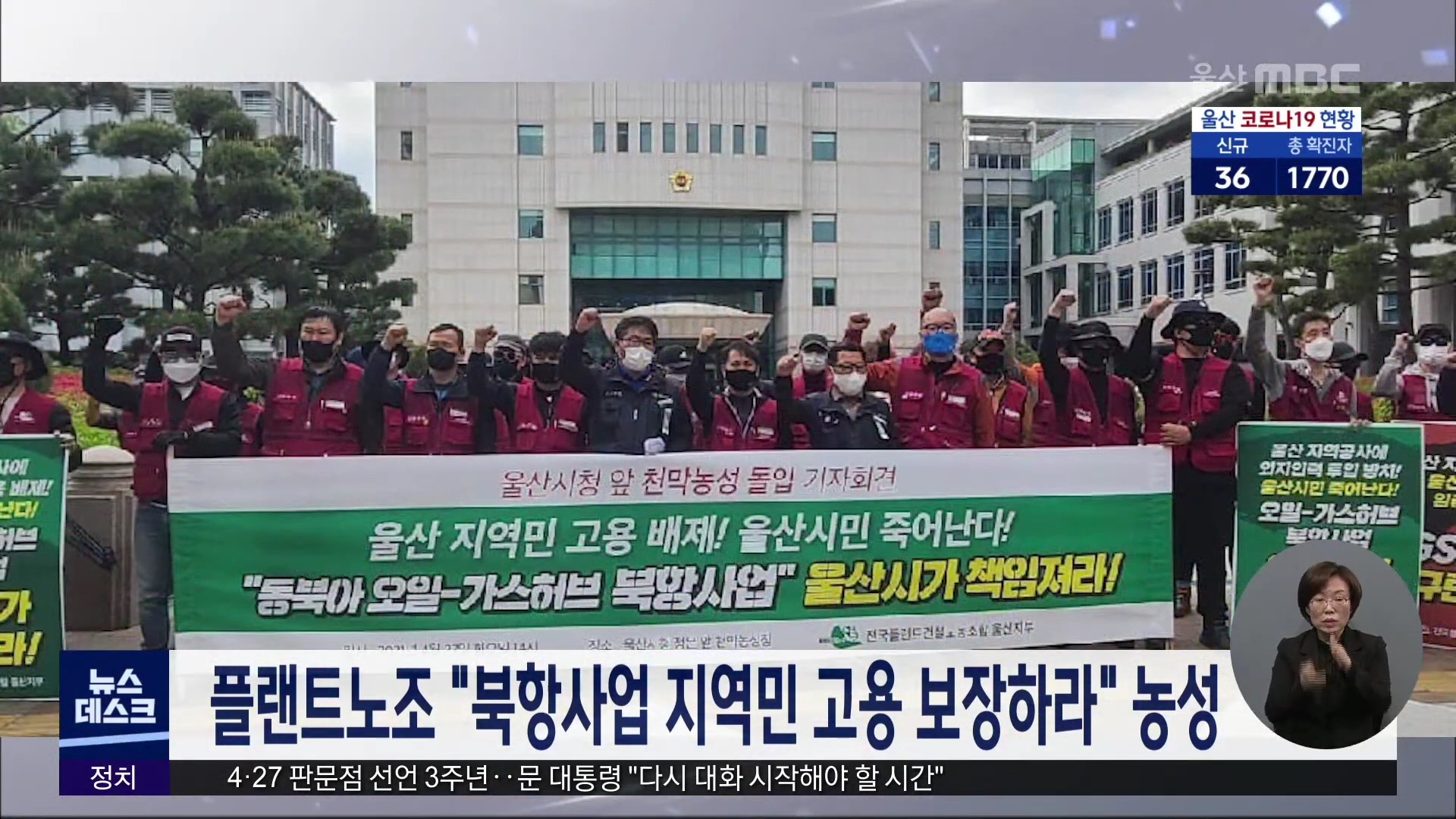 전국플랜트노조 울산지부는 동북아 오일·가스허브 북항 건설사업에서 울산지역 노동자들의 채용이 배제되고 있다고 주장하며 울산시청 앞에서 천막 농성에 돌입했습니다. 이들은 북항사업 현장에서 LNG 탱크를 제작하는 한 업체가 약속과 달리 외지인만을 고용하고 울산지역보다 낮은 노동조건을 적용하고 있다고 주장했습...