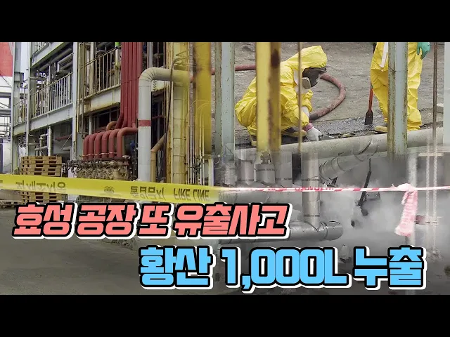 ◀ANC▶오늘 울산 남구 용연공단에 있는 효성 울산공장에서 인체에 치명적인 황산 1천 리터가 누출되는 사고가 일어났습니다.다행히 인명피해는 없었지만 효성은 지난 2016년에도 화학물질배관이 폭발해중대산업사고 사업장에 포함되는 등사고가 계속 일어나고 있습니다.정인곤 기자. ◀END▶ ◀VCR▶산업용 원사와 타...