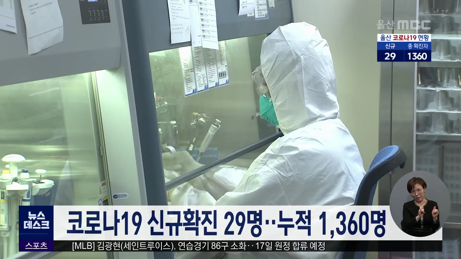 오늘(4/13) 울산에서는 코로나19 신규 확진자가 29명 발생했습니다. 이들 중 18명은 기존 확진자의 가족이나 접촉자로 확인됐습니다. 4명은 집단 감염이 발생한 울주군 자동차부품업체 관련 확진자로 파악됐고, 1명은 고용노동부 콜센터 집단감염 확진자의 접촉자였습니다. 나머지 6명은 증상이 나타나 검사를 받거나 병원 ...