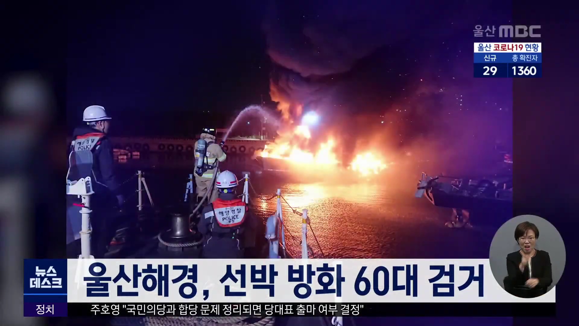 울산해양경찰서는 선박에 불을 지른 혐의로 60대 A씨를 붙잡아 조사하고 있습니다. A씨는 지난 6일 밤, 울산 남구 성외항에 정박한 낚시 어선에 불을 질러 4억 원 상당의 피해를 발생시킨 혐의를 받고 있습니다. 울산해경은 A씨를 상대로 범행 동기를 조사하고 있으며, 구속 영장 신청을 검토 중이라고 밝혔습니다. //