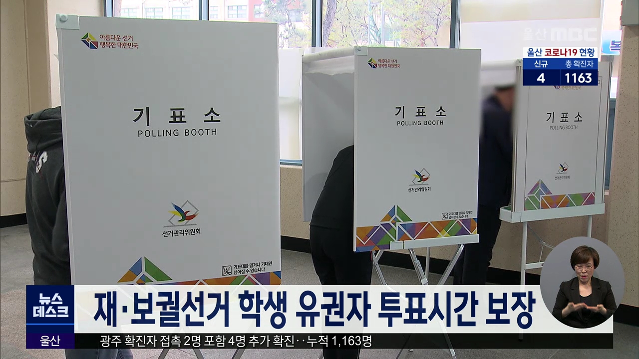 울산시교육청이 오는 4월7일 실시되는 재·보궐선거에서 18살 이상 학생 유권자의 투표권을 보장하기로 했습니다. 4월2일 사전 투표일과 4월 7일 당일 투표에 참여하려는 학생 유권자는 학교장의 허락을 받고 외출이나 조퇴를 할 수 있으며 이 경우 모두 출석으로 인정됩니다. 다만 학생들의 학습권 보장을 위해 하교 이후나...