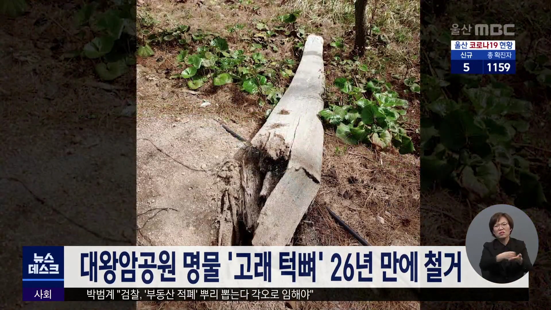 26년째 동구 대왕암공원을 지키던 명물 '고래 턱뼈'가 부서져 철거 됐습니다. 동구는 외압에 의해 부서진 것으로 보고 있으나 주변 CCTV가 없어 정확한 원인은 찾기 힘들다고 밝혔습니다. 대왕암공원 고래 턱뼈는 지난 1984년 군산 어청도 인근에서 잡힌 참고래 뼈를 기증받은 것으로 1995년부터 설치됐습니다.