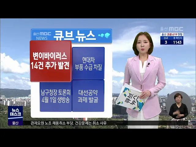 울산에서 영국발 코로나19 변이 바이러스 감염 사례가 14건 추가로 확인됐습니다.울산시는 질병관리청에 변이 바이러스 유전자 검사를 의뢰한 결과 북구 히어로스파 관련 감염에서 7건, 부산 장례식장발 감염에서 5건 등 모두 14건이 영국발 변이 바이러스에 의한 감염으로 확인됐다고 밝혔습니다.이로서 울산에서는 확진자...