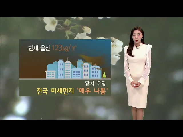 [황사의 영향, 미세먼지 '매우 나쁨'.. 당분간 큰 일교차]1) 월요일인 오늘 공기가 답답하겠습니다. 몽골 고비사막과 중국 내몽골고원에서 발원한 황사가 북서풍을 타고 우리나라에 유입되고 있는데요. 때문에 현재 울산의 미세먼지 농도는 123 마이크로그램까지 올라 있습니다. 오늘 울산을 포함한 전국의 미세먼지 농도가...