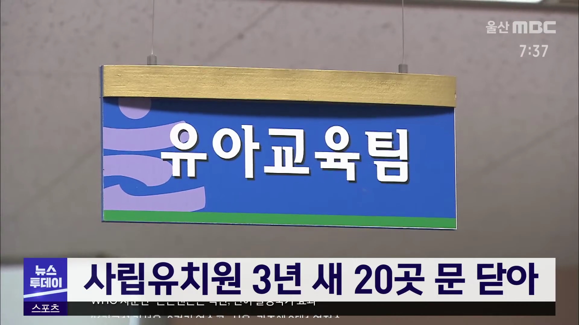 학령인구 감소로 원아 모집에 어려움을 겪고 있는 사립유치원이 경영난으로 문을 닫고 있습니다. 울산시교육청에 따르면 올해 6곳의 사립유치원이 문을 닫는 등 최근 3년새 20곳이 문을 닫았습니다. 사립유치원연합회 관계자는 사립유치원 지원을 늘리거나 사립유치원을 매입해 공립유치원으로 전환할 필요가 있다고 밝혔습...