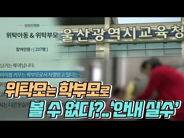 ◀ANC▶울산의 한 위탁모가 공립 유치원으로부터차별을 당했다는 청원 글을 올렸습니다.친권자가 아닌 후견인은 '학부모'로 보지 않아학부모운영위원에신청할 수 없었다는 내용인데요.울산시교육청은 유치원의 잘못된 안내로빚어진 일이라고 해명했습니다.김문희 기자. ◀END▶ ◀VCR▶지난 15일 청와대 국민청원에 올...