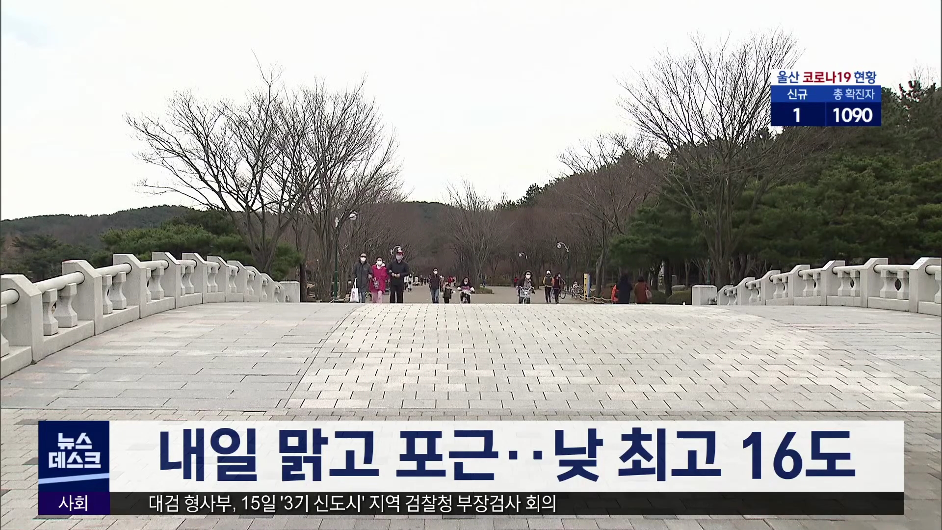 오늘(3/13) 울산지방은 구름 많은 많은 가운데 낮 최고 기온이 13.9도로 포근했습니다. 내일(3/14)은 맑은 가운데 아침 최저 4도, 낮 최고 16도로 일교차 큰 날씨를 보이겠으며 초미세먼지 수치도 보통 수준으로 야외활동하기 좋은 날씨가 예상됩니다. 다음주 초반까지는 따뜻한 남서풍의 영향으로 평년 수준을 웃도는 포근...