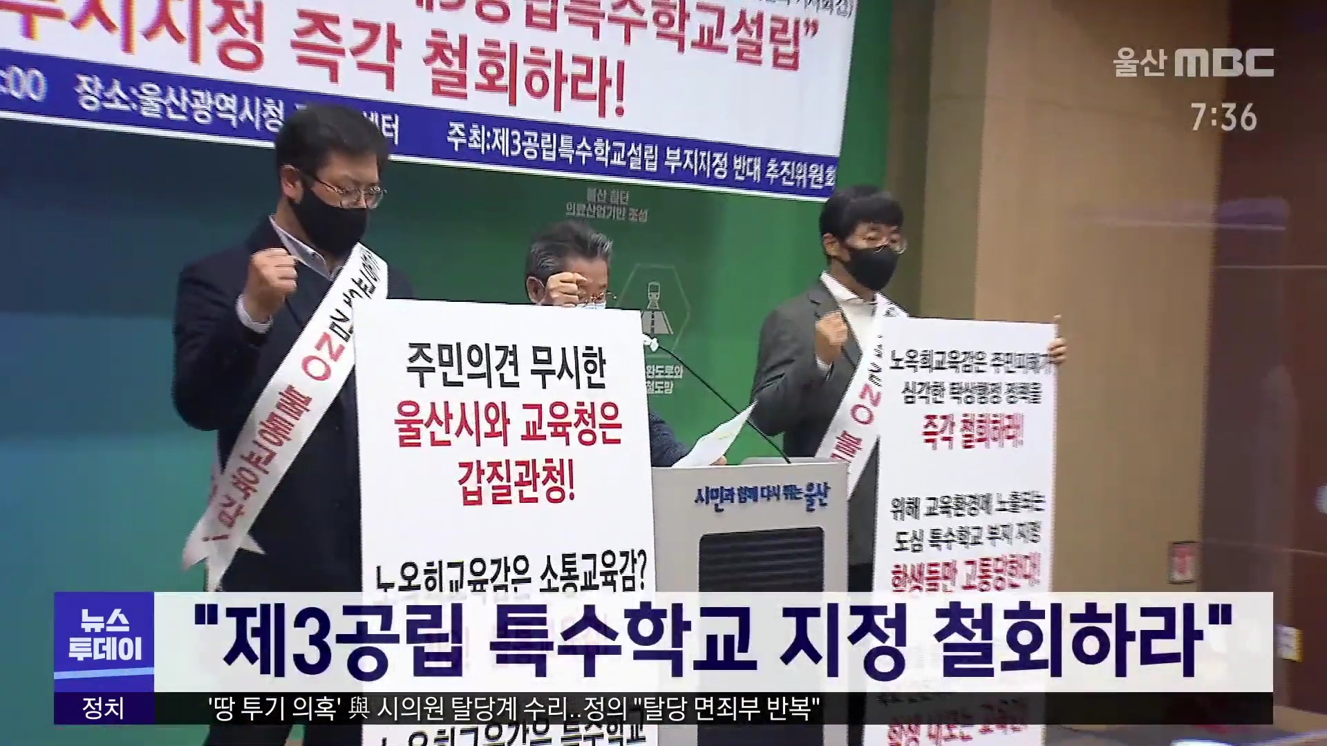 남구 야음동 일원에 제3공립 특수학교를 설립하는 것과 관련해 편입 토지 소유자 63명과 인근 주민들은 오늘(3/9) 기자회견을 갖고 특수학교 부지 지정 철회를 요구했습니다. 이들은 토지 매입가가 너무 낮아 사유 재산권이 침해되며 인근에 자동차운전학원과 골프연습장 등이 있어 학습 환경도 좋지 않다고 주장했습니다. ...